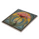 Une fleur de pavot rose avec une longue tige, entourée de feuilles bleus et verts, dressée contre un dégradé ambiant du coucher du soleil se détache du jaune au bleu clair arrière - plan, dans un cadre carré avec une bordure décorative noire et bleue.