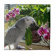 Congo African Grey Parrot posant parmi les fleurs violettes de l'orchidée Phalaenopsis dans le jardin. Une jolie photo pour les amateurs d'oiseaux en vous !