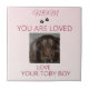 This sweet Mother’s Day ceramic tile features your pet’s photo centered on a soft blush‑to‑cream gradient background for a warm, gentle look. Above the image, the message “Mom You Are Loved” appears with two tiny pawprints for a heartfelt, pet‑themed touch. Beneath the photo, the word “love” sits gracefully above a customizable nickname, creating a meaningful keepsake for dog moms, cat moms, and anyone who cherishes their furry companion. Display it as décor, use it as a trivet, or add it to a gallery wall for a sentimental accent.
