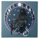 Corbeau tribal assis dans un cercle d'étoiles et de phases de lune, le tout dessiné dans un style Art nouveau dans un décor de bleus et de violets