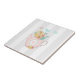 Tuile en céramique avec illustration fantaisiste. Une théière rose avec un petit coeur rose au centre et un bouquet de fleurs à l'intérieur. De délicieux papillons de couleur pastel floutent autour. Placé sur un arrière - plan rayé gris et blanc.