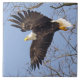 Un bel aigle chauve étend ses ailes vers l'avant juste après avoir sauté de son perchoir sur une branche d'arbre.