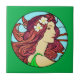 Carreaux en céramique dans un portrait circulaire, de style Art Nouveau, d'une belle jeune femme aux cheveux longs, fluides, rouges, sur un arrière - plan vert émeraude