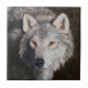 Face d'un loup de bois gris aux yeux orange vif. OEuvre d'art réaliste créée à partir d'une peinture à l'huile originale de l'équine et de l'artiste faunique Crista S. Forest.