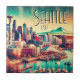 Cette image artistique de Seattle montre l'emblématique Aiguille Spatiale debout face à l'horizon moderne de la ville. La scène capture Elliott Bay avec des bateaux au premier plan et le majestueux Mont Rainier en arrière - plan. Les couleurs vives et les jours ensoleillés évoquent l'énergie dynamique et la beauté naturelle de cette ville du nord-ouest du Pacifique. Le style allie réalisme et tons chaleureux et accueillants pour créer une vue pittoresque.