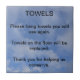 Signe de conservation de serviette pour un hôtel. Veuillez accrocher les serviettes que vous emploierez encore. Des serviettes sur le plancher seront remplacées. Le Merci pour nous aider conservent.