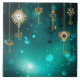 Or, clés antiques avec engrenages et cadrans accrochés sur chaînes dorées sur arrière - plan vert lumineux.