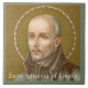 Le noble et soldat basque espagnol devenu prêtre et théologien, saint Ignace Loyola (1491-1556) fut fondateur et premier supérieur général de la Société de Jésus (les Jésuites). Ici, St Ignace est habillé de style jésuite. Il porte une simple chaussette noire, probablement emballée et filmée à la taille non boutonnée sur le devant, et une cape noire collée. Il tient un livre ouvert, probablement la sainte Règle de la Société, inscrit avec la devise des Jésuites "[Omnia] ad majorem Dei gloriam", c’est-à-dire "[Toutes choses] pour la plus grande gloire de Dieu". (Le livre n'est pas visible dans ce détail.) Liés par un voeu d'obéissance spéciale au Pape, les Jésuites entreprirent un travail missionnaire et une éducation en orthodoxie sous directives papales au 16ème siècle, jouant un rôle particulièrement important dans la Contre-Réforme. + Fête : 31 juillet + Crédit image (JM 27) : Détail d'une image antique de St. Ignatius Loyola, initialement publiée dans la chromolithographie par Josef Müller Art Publisher, Munich et New York, premier quart du 20e siècle, de la collection privée de l'architecte d'éphémère religieux. Il ne s'agit que d'une des plus de soixante images dans un style très populaire de tirages dévotionnels émis en plusieurs tailles et formats par Müller au tournant du dernier siècle.