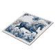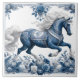Un pied céleste, capturé au milieu du trottoir, rayonne la splendeur florale de cette tuile en céramique. Des motifs floraux détaillés, évoquant les fleurs en fleurs, ornent le corps du cheval, crinière coulante et queue, faisant écho aux motifs sur sa selle ou son harnais décoratifs. L'artiste dépeint habilement les puissants muscles et les mouvements fluides de l'animal. Une bordure de motifs floraux complexes dans la même teinte bleue profonde encadre l'oeuvre d'art. La composition équilibrée et une perspective légèrement surélevée mettent en évidence la posture dynamique du cheval. Couleurs feutrées et lumière tamisée créent une atmosphère sereine et vintage, évocatrice du design classique du carrelage. Cette pièce méticuleusement rendue présente la beauté et l'art classiques.