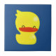 Un canard en caoutchouc jaune gai et souriant contre un carrelage en céramique arrière - plan bleu.