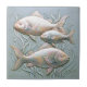 This coastal ceramic tile features three beautiful opalescent fish surrounded by an intricate arrangement of swirling sea grass and bubbles. The soft, dusty blue background is lightly textured giving it an aged patina perfect for beach homes, nautical décor themes, accent walls, backsplashes, and decorative coastal projects. Note: design may contain generative content.