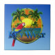 Key West Florida, la ville la plus au sud des États-Unis. un tableau de plage avec des palmiers, un cadre rond en bambou et un perroquet coloré au-dessus de l'eau bleue de l'océan.