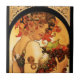 Tuile de fruit d'Alphonse Mucha. Affiche de lithographie à partir de 1897. L'artiste tchèque Alphonse Mucha a peint une série de différentes allégories dans toute sa carrière. Le fruit dépeint une belle femme tenant une bracée de raisins pourpres, de poires vertes, de figues et de pommes rouges. Les cheveux foncés de la femme sont ornés avec les fleurs et le feuille, et elle porte une robe bleu-clair de nouveau d'art avec les fermoirs et le brassard argentés d'or. Un beau cadeau pour des fans de Mucha, d'affiches de nouveau d'art, et de copies de cru.