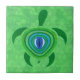 Une tortue de mer verte à l'oeil bleu vif dans le dos. Les carreaux sont disponibles en deux tailles : 4,25 x 4,25 pouces et un grand 6 x 6 pouces.