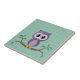 White Ceramic Tile a un mignon chouette chouette chouette en caricature violette sur un membre avec un arrière - plan de motif à pois vert. Personnalisable.