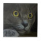 Un tir en gros plan du visage d'un chat gris avec les yeux jaunes et les élèves dilatés, reposant sa tête sur sa patte et regardant fixement attentivement quelque chose derrière l'appareil-photo.