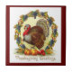 Jolie, colorée, photo vintage d'une dinde dans une couronne, est présenté sur cette tuile en céramique pour la fête de Thanksgiving. Le message sur cette tuile dit, "Salutations d'action de grâces", utiliser comme un trivet ou pour décorer pour les fêtes. fait aussi un grand petit cadeau !