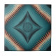 Un design motif géométrique symétrique au format carré avec un jeu de couleurs turquoise et cuivre. Le centre comprend un grand médaillon en forme de losange avec un travail en ligne complexe et un motif de sunburst circulaire à l'intérieur. Le médaillon est entouré de quatre petits cadres en forme de losange avec des motifs de bordure ornés. L'arrière - plan a un effet de sunburst rayonnant émanant du centre, créant un sens dynamique du mouvement. La bordure extérieure est constituée de pointes en cuivre, en forme de dent, déchiquetées contre l'arrière - plan turquoise. L'ensemble est entouré d'une fine bordure en pointillés. La palette de couleurs passe du turquoise profond au centre à des tons turquoise plus clairs près des bords, avec des accents de cuivre dans les pointes et les éléments décoratifs. Le motif a une influence de conception amérindienne ou du sud-ouest avec ses formes géométriques et ses motifs rayonnants.