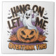Un fantôme ludique avec les bras levés avec lucidité repose sur un citrouille étincelant entouré de feuilles et de chauves-souris d'automne, incarnant l'esprit d'Halloween.