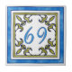 Un cadre bleu et vert tiré par la main autour d'un numéro de maison bleu sur un arrière - plan blanc, avec des contours bleu-foncé et un motif floral dans les coins.