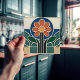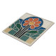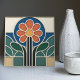 Add a touch of timeless artistic flair to your home with this stunning ceramic tile, inspired by the elegant Art Nouveau movement. The design showcases a beautifully stylized daisy, bursting with color. Its vibrant orange-red petals radiate from a cheerful sunny yellow center, creating a warm and inviting focal point. The flower is artfully framed by a bold royal blue arch and flanked by lush, deep green leaves. The composition rests on a geometric base of muted beige and teal, grounding the organic forms above. Each colored section is outlined with clean, creamy-white raised lines, giving the tile a delightful tactile quality and a look reminiscent of classic stained glass. This versatile tile is perfect for creating a memorable accent in a kitchen backsplash, bathroom, or as a unique decorative piece.