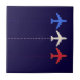 Blue, white and red planes aligned with dotted routes