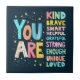 Ce design typographique dynamique et stimulant éclate de couleur et de positivité, ce qui en fait un rappel parfait de l'estime de soi et de la confiance. Avec des lettres audacieuses et artistiques dans un mélange ludique de motifs et de textures, les mots "Vous êtes" prennent vie en même temps que des affirmations habilitantes comme "Le genre", "Courageux", "Fort" et "Aimé". Les gribouillis, les étoiles éparpillées et les fleuris charmants ajoutent une esthétique boho moderne et amusante, mêlant éléments d'art populaire et typographie contemporaine. L'arrière - plan bleu foncé améliore les couleurs vives, créant un contraste frappant qui fait ressortir le message. Idéal pour ceux qui apprécient la typographie artistique avec une touche de créativité, ce design rayonne d'encouragement et de chaleur, embrassant un style visuel joyeux et expressif. Que vous soyez attirés par l'énergie joyeuse du maximalisme ou par le charme réconfortant de l'esthétique indie, cette pièce parle au coeur avec son esprit de célébration et de motivation. L'IA a généré des oeuvres d'art.
