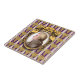 L'illustration originale de ZoeSPEAK sur ce petit Carrelage en céramique présente un portrait du compositeur de musique classique Wolfgang Amadeus Mozart. Le portrait est un ensemble de profil dans un cadre doré ovale orné. Le cadre est accroché sur un papier peint violet arrière - plan avec des grappes dorées de raisins en rangs, et des rayures verticales blanches et lavandes.
