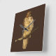 Cette horloge murale présente une femelle Buse à queue rouge (Buteo jamaicensis). Un des oiseaux de proie les plus répandus et les plus observés en Amérique du Nord, ce chasseur féroce est perché sur une branche en hauteur dans un arbre, attendant patiemment l'apparition d'un repas. Sa tête est brune et la poitrine blanche crémeuse a des taches brunes. La queue rouge n'est visible que de l'arrière.