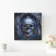 Fresque crâne gothique sur un mur de pierre usé et en ruines, réalisée avec des gravures complexes et une subtile luminescence, évoquant un air de mystérieuse avant-garde, au milieu d'une palette de bleus et violets profonds et riches, ponctués de éclats d'ocre doré, avec des détails ornés ressemblant à une architecture délicate et gothique, des tendres tourbillants de crevy En dormant sur les bords, et subtilement, des étincelles brûlantes se sont dispersées partout, comme si le crâne lui-même était sur le point de s'animer, imprégnant la scène d'une qualité cinématographique hantante.