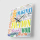 Ce dessin présente un vocabulaire relatif à l'écriture de fiction. Les mots sont définis en plusieurs polices et couleurs et arrangés en art des mots. Ces éléments sont placés contre un arrière - plan blanc. Cette conception est disponible sur les autres modèles d'horloge.