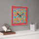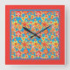 Une horloge murale carré, avec un joyeux motif de fleurs rouges, orange et jaunes sur un arrière - plan turquoise, d'un collage de papier peint à la main par Judy Adamson.
