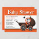 These Halloween Baby Shower invitations, in orange, brown, and black, are designed with a spooky & cute baby carriage and a happy baby hanging over the side holding a lollipop.