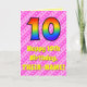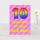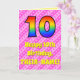 La façade de cette carte de voeux joyeuse et amusante sur le thème du 10e anniversaire comporte un grand nombre de "10" ayant un motif coloré inspiré de l'aspect d'un arc-en-ciel. Il comporte également le message "Joyeux 10e anniversaire", suivi d'un nom de destinataire personnalisé. Le arrière - plan de l'avant présente un joyeux motif de rayures rose clair et rose foncé, aux coeurs roses aimantes. L'intérieur comporte un message de salutation d'anniversaire personnalisé, ou peut-être pourrait-il être effacé et laissé vide si un message doit être écrit à la main à la place. Une carte d’anniversaire personnalisée comme celle-ci pourrait être une façon amusante de reconnaître le dixième anniversaire de quelqu’un. [~Z0000416]