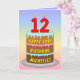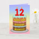 Cette carte de voeux d'anniversaire, optimiste et joyeuse, présente une représentation en bande dessinée d'un gâteau d'anniversaire à trois niveaux, avec des bougies en forme de chiffres sur le dessus, portant le numéro "12", ainsi que le message "HAPPY 12TH BIRTHDAY", et un nom de destinataire personnalisé. L'arrière - plan de l'avant dispose d'un motif multicolore pastel en arc-en-ciel inspiré du spectre dégradé. L'intérieur comporte un message de voeux d'anniversaire customisé, ou peut-être pourrait-il être effacé et laissé vide si un message doit être écrit à la main à la place. Une carte de voeux d'anniversaire colorée et personnalisable comme celle-ci pourrait être une façon amusante d'envoyer des voeux d'anniversaire à quelqu'un qui célèbre son douzième anniversaire. [~Z0000625]