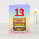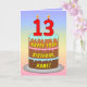 Cette carte de voeux d'anniversaire, optimiste et amusante, présente une représentation en bande dessinée d'un gâteau d'anniversaire à trois niveaux, avec des bougies en forme de chiffre sur le dessus montrant l'âge de "13 ans", ainsi que le message "HAPPY 13TH BIRTHDAY", et un nom de destinataire personnalisé. L'arrière - plan de l'avant dispose d'un motif multicolore pastel en arc-en-ciel inspiré du spectre dégradé. L'intérieur a un message de voeux d'anniversaire personnalisable, ou peut-être peut-être être effacé et laissé vide si un message doit être écrit à la main à la place. Une carte de voeux d'anniversaire colorée et personnalisée comme celle-ci pourrait être une façon amusante de transmettre un message d'anniversaire à quelqu'un qui célèbre son treizième anniversaire. [~Z0000625]
