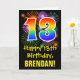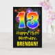 L'avant de cette carte de voeux colorée, amusante et passionnante sur le thème de l'anniversaire comprend un grand nombre de "13" ayant un motif inspiré par un gradient de spectre arc-en-ciel. Il contient également le message "Joyeux 13e anniversaire", ainsi qu'un nom de destinataire personnalisable. Le front a en outre un motif arrière - plan coloré inspiré par l'apparition de feux d'artifice de célébrations éclatants. L'intérieur comporte un message de voeux d'anniversaire personnalisable, ou peut-être pourrait-il être effacé et laissé vide si un message doit être écrit à la main à la place. Une carte d’anniversaire personnalisée comme celle-ci pourrait être une façon amusante de célébrer le treizième anniversaire de quelqu’un. [~Z0000442]