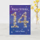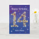Carte d'anniversaire du 14e anniversaire. 14 en Étoiles - Numéro d'âge - Quatorzième carte d'anniversaire - Arrière - plan bleu - Texte personnalisable Carte bleue avec numéro d'étoile - le numéro "14" est créé avec étoiles jaunes, rouges et blanches Texte personnalisable : devant la carte : Joyeux anniversaire et ajoutez votre nom. Texte personnalisable : Carte intérieure : Wishing You a Very Happy 14th Birthday. Vous pouvez modifier ou supprimer le texte comme vous le souhaitez, en cliquant sur "Personnaliser ce modèle". Plus de couleurs et d'autres âges sont disponibles. Si vous avez des besoins spécifiques, veuillez me contacter