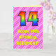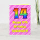Le devant de cette carte de voeux joyeuse et amusante sur le thème du 14e anniversaire comporte un grand nombre de "14" ayant un motif coloré inspiré par l'apparence d'un arc-en-ciel. Il comporte également le message "Joyeux 14e anniversaire", suivi d'un nom de destinataire personnalisé. Le arrière - plan de l'avant est doté d'un motif à rayures rose foncé et rose pâle contenant des coeurs roses aimantes. L'intérieur comporte un message de salutation d'anniversaire personnalisé, ou peut-être pourrait-il être effacé et laissé vide si un message doit être écrit à la main à la place. Une carte d’anniversaire personnalisée comme celle-ci pourrait être une façon amusante de reconnaître le quatorzième anniversaire de quelqu’un. [~Z0000416]