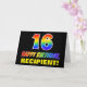 L'avant de cette carte de voeux d'anniversaire colorée, joyeuse et amusante comporte un grand nombre de "16" et le message "HAPPY BANTHDAY", tous deux colorés avec un motif inspiré par un gradient de spectre arc-en-ciel, ainsi qu'un nom de destinataire personnalisable jaune gras. L'avant présente également un arrière - plan noir minimal. L'intérieur a un message d'anniversaire personnalisé, ou peut-être peut-être être effacé et laissé vide si un message doit être écrit à la main à la place. Une carte d’anniversaire personnalisable comme celle-ci pourrait être une façon amusante de reconnaître le seizième anniversaire de quelqu’un. [~Z0000472]