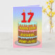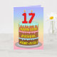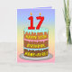 Cette carte de voeux joyeuse et colorée à thème d'anniversaire présente une représentation de dessin animé d'un gâteau d'anniversaire à trois niveaux avec des bougies en forme de chiffre sur le dessus montrant l'âge de "17", avec le message "HAPPY 17TH BIRTHDAY," et un nom de destinataire personnalisé. L'arrière - plan de l'avant dispose d'un motif multicolore pastel en arc-en-ciel inspiré du spectre dégradé. L'intérieur comporte un message d'anniversaire personnalisé, ou pourrait être effacé et laissé vide si un message doit être écrit à la main à la place. Une carte de voeux d’anniversaire joyeuse et modifiable comme celle-ci pourrait être envoyée pour célébrer le dix-septième anniversaire de quelqu’un. [~Z0000625]