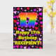 La face avant de cette conception de carte de vœux d'anniversaire joyeuse et gaie comporte un grand nombre « 17 » ayant un motif inspiré d'un dégradé de spectre d'arc-en-ciel. Elle comporte également le message « Joyeux 17e anniversaire » et un nom personnalisable. Le fond de la face avant présente un motif de formes de cœur avec des couleurs comme le rouge, le rose et le violet. L'intérieur comporte un message d'anniversaire personnalisé, ou pourrait éventuellement être effacé et laissé vide si un message doit être écrit à la main à la place. Une carte de vœux d'anniversaire joyeuse et modifiable comme celle-ci pourrait être envoyée pour célébrer le dix-septième anniversaire de quelqu'un.
