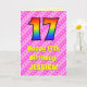 L'avant de cette carte de voeux à thème de 17ème anniversaire optimisée et amusante comprend un grand nombre de "17" ayant un motif coloré inspiré par l'aspect d'un arc-en-ciel spectre. Il contient également le message "Joyeux 17e anniversaire", suivi d'un nom de destinataire personnalisable. L'arrière - plan de l'avant est doté d'un motif à rayures rose foncé et rose clair, aux coeurs roses aimés. L'intérieur comporte un message de voeux d'anniversaire customisé, ou peut-être pourrait-il être effacé et laissé vide si un message doit être écrit à la main à la place. Une carte d'anniversaire personnalisée comme celle-ci pourrait être une façon amusante d'envoyer des voeux d'anniversaire à quelqu'un qui célèbre son dix-septième anniversaire. [~Z0000416]