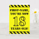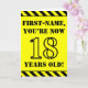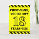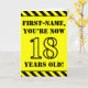 Le recto de cette carte de voeux amusante et attirant l’attention sur le thème de l’anniversaire comporte un nom modifiable et le message "VOUS AVEZ MAINTENANT 18 ANS!" en texte de pochoir noir sur un arrière - plan de couleur jaune. Il y a aussi un motif rayé noir et jaune accrocheur aux bords supérieur et inférieur de l'avant. L'intérieur comporte un message de voeux d'anniversaire personnalisable, ou peut-être pourrait-il être effacé et laissé vide si un message doit être écrit à la main à la place. Une carte d’anniversaire personnalisable comme celle-ci pourrait être une façon amusante d’envoyer un message pour célébrer le dix-huitième anniversaire de quelqu’un. [~Z0000413]