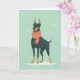 Celebrate the season with this elegant Doberman Pinscher Christmas card, illustrated in a mid-century modern style inspired by classic 1950s holiday artwork. The sleek Doberman—standing tall and alert, wrapped in a cozy winter scarf as gentle snow falls—captures the intelligence, loyalty, and graceful strength that define this striking breed. Clean lines, muted colors, and painterly simplicity give the design a refined yet warm holiday feel.