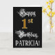 L'avant de cette carte de voeux élégante et luxueuse à thème d'anniversaire comporte le message "Joyeux 1er anniversaire", ainsi qu'un nom de destinataire personnalisé. Une partie du message est dans un texte de style script sophistiqué, le grand numéro "1st" a un faux/imitation motif de look d'inspiration or, et l'arrière - plan est coloré noir. L'intérieur a un message de voeux d'anniversaire personnalisable, ou peut-être peut-être être effacé et laissé vide si un message doit être écrit à la main à la place. Une carte de voeux d'anniversaire formelle et personnalisée comme celle-ci pourrait être une façon respectable d'envoyer des voeux d'anniversaire à quelqu'un qui célèbre son premier anniversaire. [~Z0000559]