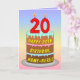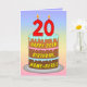 Cette carte de voeux amusante et attrayante sur le thème de l'anniversaire présente une représentation de dessin animé d'un gâteau d'anniversaire à trois niveaux avec des bougies en forme de chiffres sur le dessus montrant le numéro "20", avec le message "HAPPY 20TH BIRTHDAY", et un nom de destinataire personnalisé. L'arrière - plan de l'avant a un motif multicolore pastel en arc-en-ciel inspiré du spectre dégradé. L'intérieur comporte un message d'anniversaire personnalisé, ou pourrait être effacé et laissé vide si un message doit être écrit à la main à la place. Une carte de voeux d'anniversaire colorée et customisée comme celle-ci pourrait être une façon amusante de transmettre des voeux d'anniversaire à quelqu'un qui célèbre son vingtième anniversaire. [~Z0000625]
