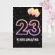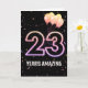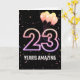 Ballons de fête et confettis sur arrière - plan noir avec le néon numéro 23 pour un 23ème anniversaire.