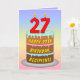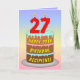 Cette carte de voeux d'anniversaire joyeuse et amusante présente une représentation de type dessin animé d'un gâteau d'anniversaire à trois niveaux avec des bougies en forme de chiffres sur le dessus montrant le numéro "27", avec le message "HAPPY 27TH BIRTHDAY", et un nom de destinataire personnalisé. L'arrière - plan de l'avant dispose d'un motif multicolore pastel en arc-en-ciel inspiré du spectre dégradé. L'intérieur comporte un message de voeux d'anniversaire personnalisé, ou peut-être pourrait-il être effacé et laissé vide si un message doit être écrit à la main à la place. Une carte de voeux d'anniversaire joyeuse et personnalisée comme celle-ci pourrait être une façon amusante de transmettre des voeux d'anniversaire à quelqu'un qui célèbre son vingt-septième anniversaire. [~Z0000625]
