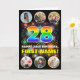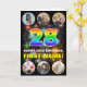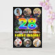 L'avant de cette carte de voeux amusante et joyeuse sur le thème de l'anniversaire comprend un grand numéro "28" avec un motif multicolore du spectre arc-en-ciel inspiré par dégradé, avec le message "HAPPY 28th BIRTHDAY", et un nom personnalisé, sur un motif inspiré par des feux d'artifice multicolores éclatants. Près du haut et du bas de l’avant se trouvent des images qui peuvent être customisées, peut-être avec des photos de la famille et des amis du bénéficiaire. L'intérieur a un message de voeux d'anniversaire customisé, ou peut-être peut-être être effacé et laissé vide si un message doit être écrit à la main à la place. Une carte de voeux d’anniversaire joyeuse et personnalisée comme celle-ci pourrait être utilisée pour célébrer le vingt-huitième anniversaire de quelqu’un. (Photographie © Storytree Studios, Stanford, CA.) [~Z0000660]